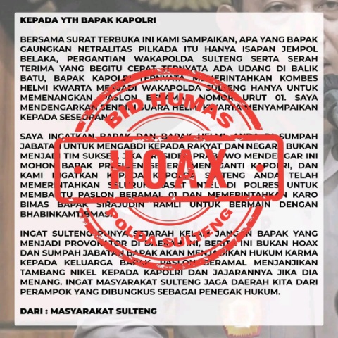 “Konten yang menarasikan, pergantian Wakapolda Sulteng untuk memenangkan paslon 01 Beramal, Polda Sulteng tidak netral dimana Kapolda Sulteng memerintahkan para kasat intel dan Dir.binmas melalui para Bhabinkamtibmas, saya pastikan itu fitnah dan hoax” tegas Kabidhumas.
