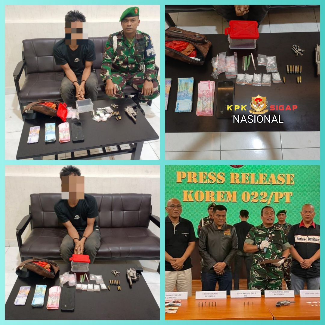 Dari penangkapan tersebut, petugas berhasil mengamankan sejumlah barang bukti, antara lain: 1 pucuk pistol revolver, 3 butir peluru kaliber 9 mm, 6 butir amunisi revolver, narkotika jenis sabu-sabu seberat 22,68 gram, uang tunai sebesar Rp 2.170.000, 1 unit HP merk Realme, 1 buah tas pinggang, 2 buah kaca pirex, 2 buah pipet, serta 1 buah tapperwer berisi plastik klip.