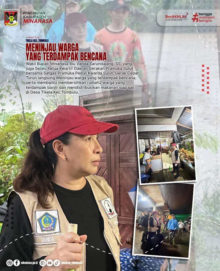 Bersama Satuan Tugas Pramuka Peduli Kwarda Sulut, Wabup Vanda Sarundajang meninjau kondisi warga yang terdampak banjir di Desa Tikela, Kecamatan Tombulu. Dalam aksi kemanusiaan tersebut, rombongan turut membantu membersihkan rumah-rumah warga yang terendam lumpur serta menyalurkan makanan siap saji dan bantuan logistik lainnya.