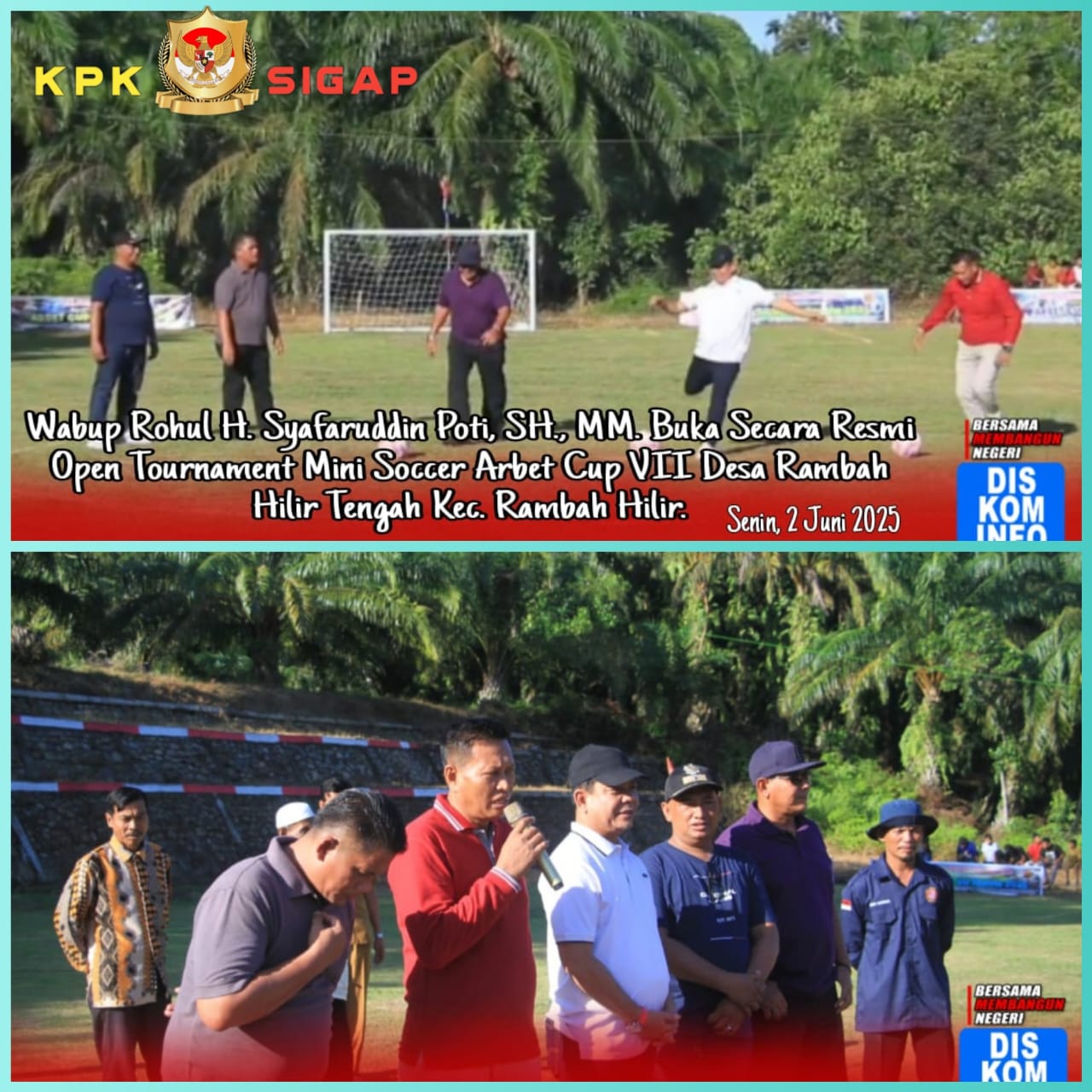 Wakil Bupati (Wabup) Rokan Hulu (Rohul) H. Syafaruddin Poti, S.H., M.M., secara resmi membuka turnamen Mini Soccer Arbet Cup VII yang digelar di Lapangan Mini Soccer Pemuda Aur Betung, Desa Rambah Hilir Tengah Kecamatan Rambah Hilir, Senin (02/06/2025).
