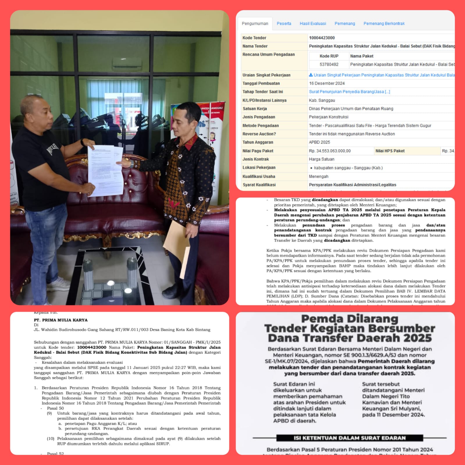 Sanggahan dan Tanggapan: Pokja merujuk pada dokumen pelaksanaan (dokpil) yang mengacu pada ketentuan tahun 2021 dalam melaksanakan proses tender. Namun, Bambang menegaskan bahwa SE larangan tender pada dana DAK 2025 sudah diterbitkan sebelum dana transfer daerah disalurkan.