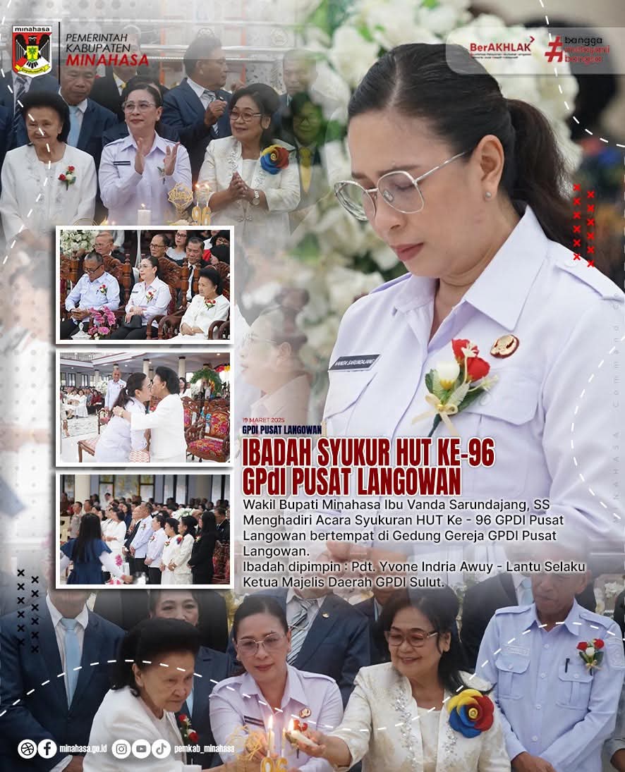 Wakil Bupati Minahasa, Ibu Vanda Sarundajang, S.S., menghadiri perayaan syukur Hari Ulang Tahun ke-96 Gereja Pantekosta di Indonesia (GPdI) Pusat Langowan yang berlangsung khidmat di Gedung Gereja GPdI Pusat Langowan, Minggu (23/3).